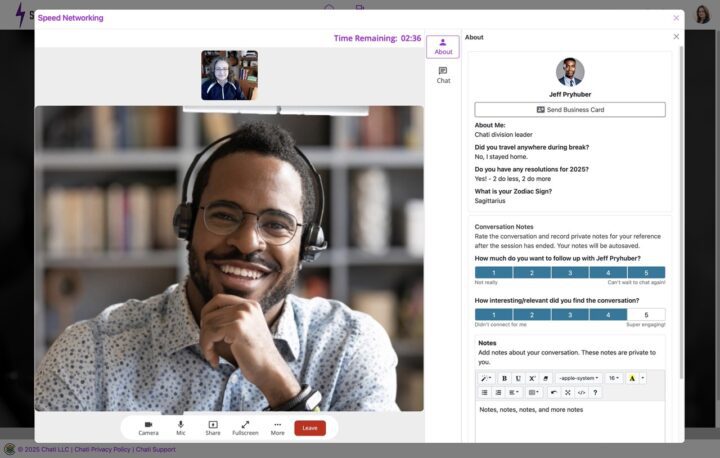 Luckily for you, Chati is jam-packed with networking features. From speed networking, to the networking hub – there are no obstacles keeping you from connecting with other attendees and even presenters.